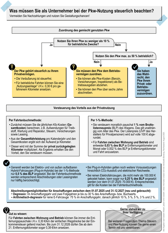 Mit Hilfe unserer Infografik auf der nächsten Seite finden Sie selbst heraus, wo Sie Ihren gemischt genutzten Pkw zuordnen müssen, und erfahren, wann Sie ein Wahlrecht haben. Und Sie lernen die steuerlichen Folgen der Zuordnungsmöglichkeiten kennen. Für Rückfragen stehen wir Ihnen gerne zur Verfügung. |