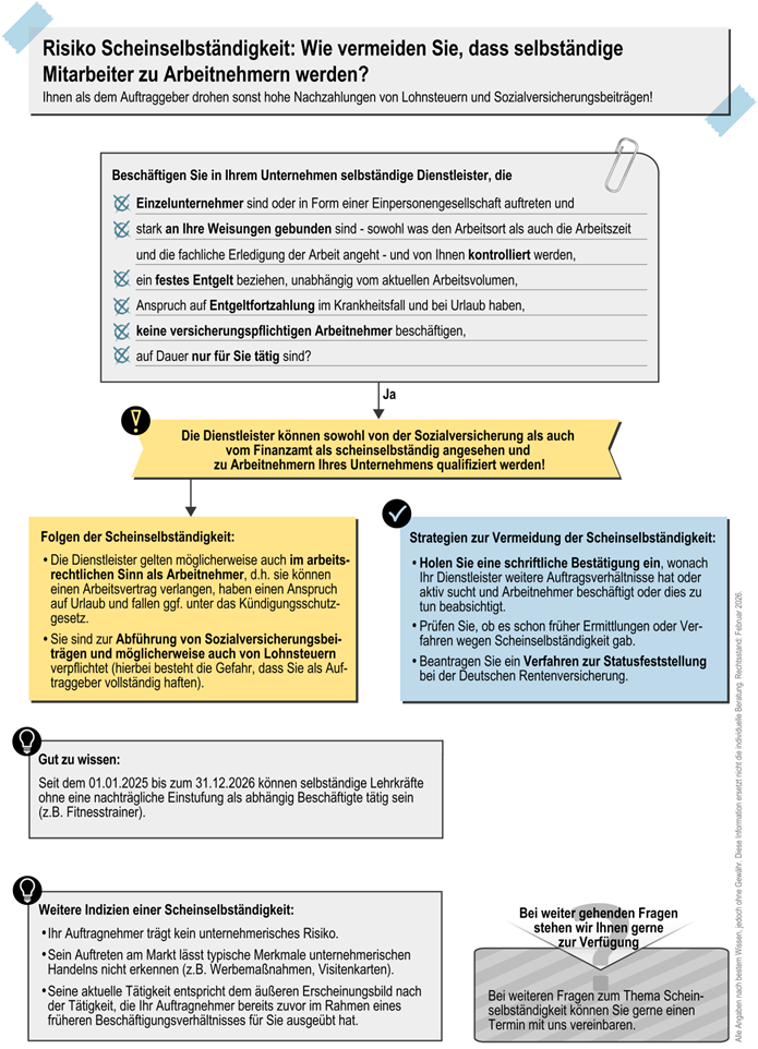 Mit Hilfe unserer Infografik auf der nächsten Seite erkennen Sie rechtzeitig das Risiko, Scheinselbständige zu beschäftigen, und sichern sich mit einfachen Mitteln gegen hohe Nachzahlungen ab. Bei individuellen Fragen beraten wir Sie gern. |